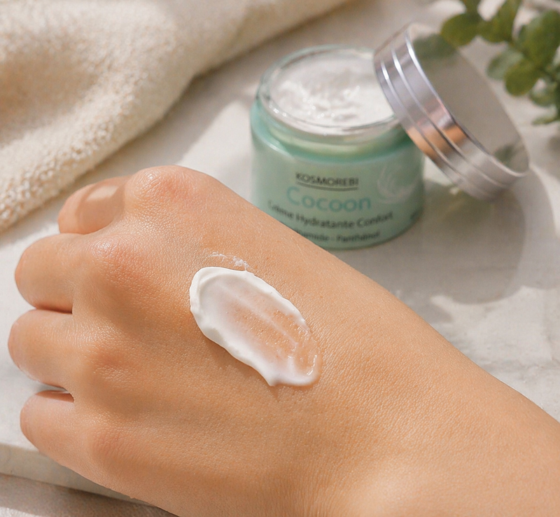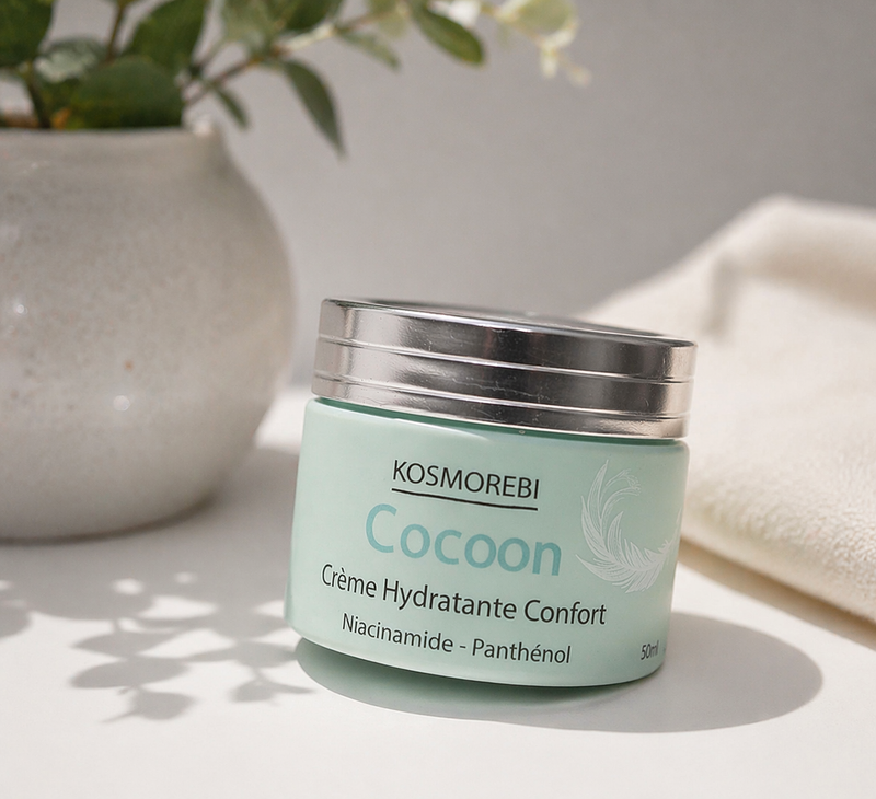 La Crème Hydratante Confort – COCOON – au niacinamide et au panthénol (Pro-Vitamine B5) convient à tous les types de peaux, même sensibles, sèches ou agressées.