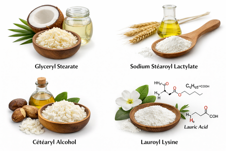 Glyceryl stearate, Sodium stéaroyl lactylate, Cétéaryl alcohol, Lauroyl Lysine:**